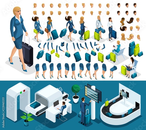 Fototapeta premium Isometric set 6 create your character, business lady at the airport. Set of...
