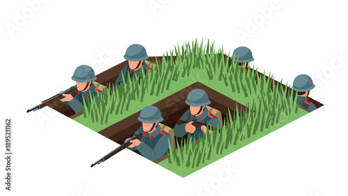 © Ophelia, Fototapeta premium Isometric soldiers in trench with grass cover during historical warfare