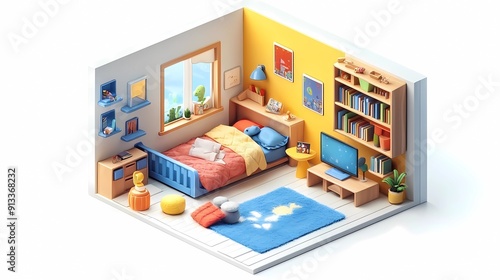 © Zandhira, Naklejka premium isometric style, colorful bedroom interior design