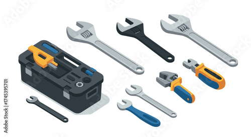 Fototapeta premium Isometric tool set with wrenches and toolbox for home improvement projects