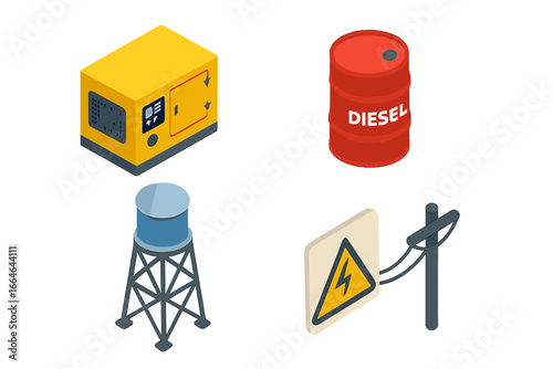© Daniela, Fototapeta premium Isometric utility icon set of power and utilities. Includes industrial diesel generator, fuel drum, water tower, and high voltage electrical sign. Vector illustration.