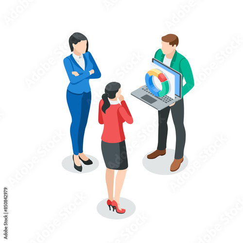 © Trostinka_25, Obraz premium isometric vector business man showing diagrams on laptop screen to womans, in color on a white background, business communication or team working with statistical data