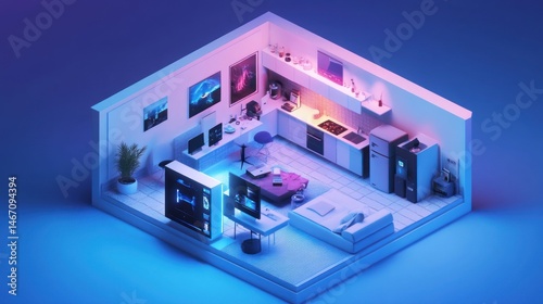 Naklejka premium Isometric view of a modern, minimalist apartment with integrated gaming setup...
