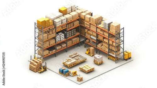 © BerkahStock, Naklejka premium Isometric view of a warehouse with shelves full of cardboard boxes and pallet jacks.