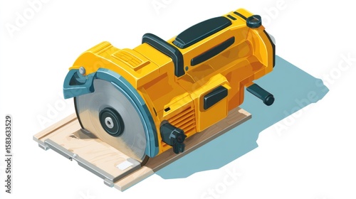 © Nurul, Fototapeta premium Isometric view of a yellow circular saw resting on a wooden base