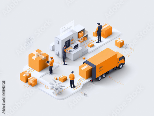 Fototapeta premium Isometric view showcases logistics. Orange boxes, workers, truck, symbolizing delivery, shipping, process, automation, efficiency, commerce, and ecommerce.