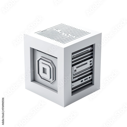 Fototapeta premium Isometric white cube with stylized hardware inside, against a black backdrop