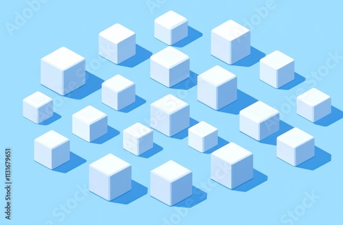 © Alfath, Fototapeta premium Isometric white cubes scattered on a light blue background, casting shadows.