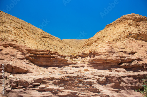 © Artem Kniaz, Obraz premium Israeli desert scenery dry landscape sand stone rocks wallpaper background view with empty vivid blue sky