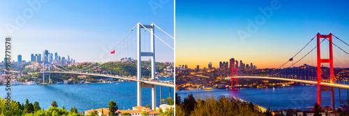 © Nikolay N. Antonov, Obraz premium Istanbul Bosphorus Bridge or 15th July Martyrs Bridge with Istanbul panorama cityscape. Two images made during summer sunny day and during evening sunset. Istanbul, Turkiye.
