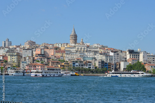 © Orhan Çam, Naklejka premium Istanbul cityscape with Galata Tower and passenger boats - Istanbul, Turkey