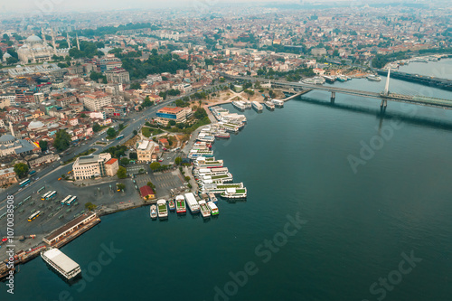 © thehakanarslan, Fototapeta premium Istanbul Halic Metro Bridge. Halic Metro Bridge and city view. Blue sea in the background and magnificent view of Istanbul bridge views. Halic, Istanbul, Turkey.
