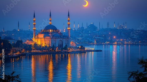 © istriyati, Fototapeta premium Istanbul Mosque at Twilight, Crescent Moon