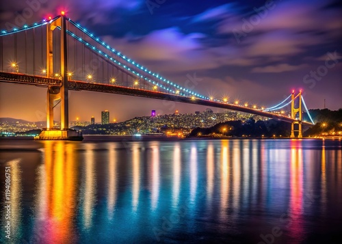 Fototapeta premium Istanbul's 15th July Martyrs Bridge at Night - Illuminated Suspension Bridge...