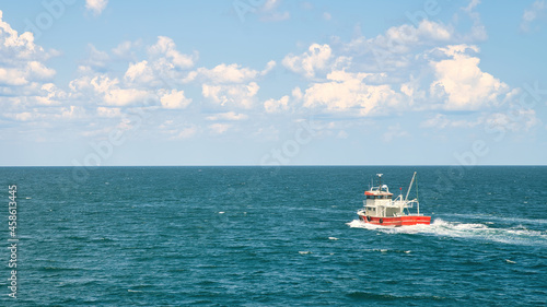 Fototapeta premium Istanbul, Turkey - August 2021: Fishing boat sailing in open waters, distant in seascape.