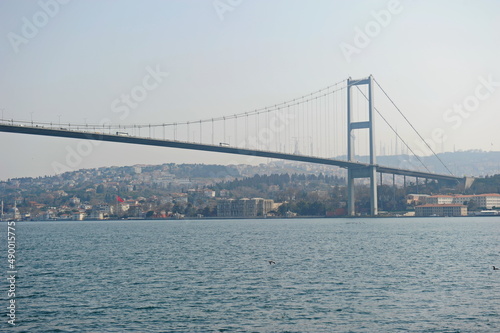 Naklejka premium Istanbul / Turkey - 02.28.2017 : Coastal zone and architecture of the Bosphorus Strait. A bridge connecting Europe and Asia.