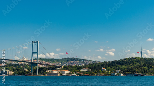 Naklejka premium Istanbul, Turkey. View of the Bosporus Strait and Bosphorus Bridge. Beautiful city view The Grand Chamlija mosque in the background