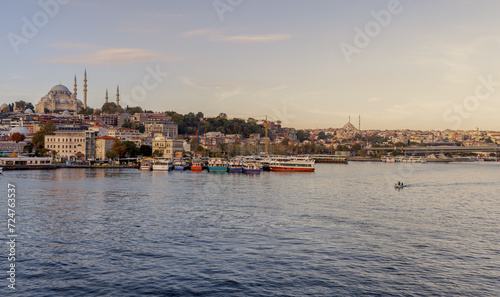© Armensl, Fototapeta premium Istanbul, Turkey - 09.10.2022: View of the embankment, water and ships in the city of Istanbul on a summer day. Big ferry ship sail at Bosphorus strait, mosques of Fatih area seen on back.