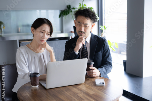 Obraz premium パソコンを見ながら業績やit化(dx)に悩む男女のビジネスシーン