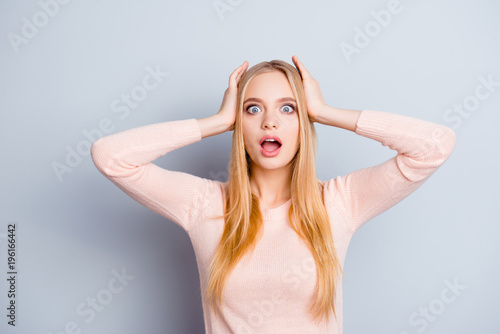 © deagreez, Obraz premium It's black friday! Unexpected incredible grimace people concept. Close up portrait of cute beautiful pretty lovely with big blue eyes businesswoman holding head with hands isolated on gray background
