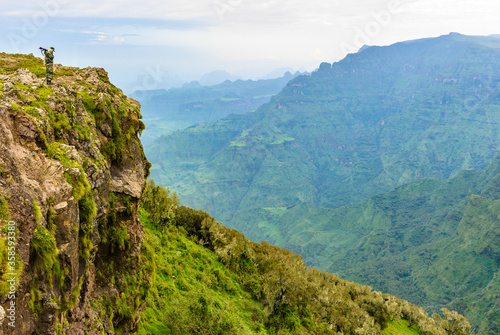 Fototapeta premium It's Man with a gun stay on the edge of the mountain and thinks
