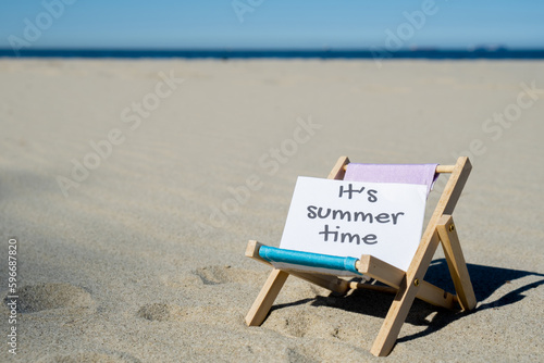 Naklejka premium IT'S SUMMERTIME text on paper greeting card on background of beach chair lounge summer vacation decor. Sandy beach sun. Holiday concept postcard. Travel Business concept