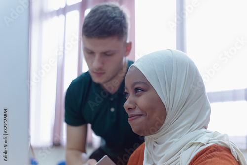 © as-artmedia, Obraz premium IT technologies teacher at work. IT professor explain lesson to multietchnic students.