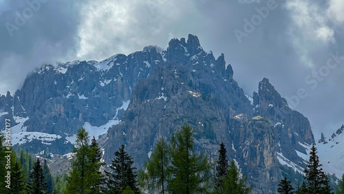 Fototapeta premium italian alps dolomites national park lake mountain trekking peaks tre cime brais lake carezza lake reflection clouds