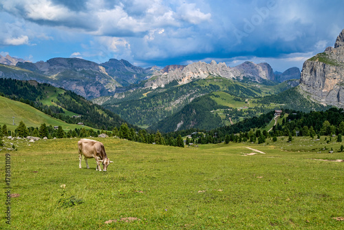 Naklejka premium Italian cow standing on a green alpine meadow with the Dolomites mountains in...