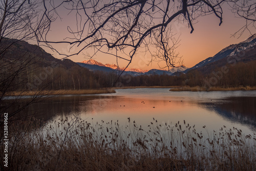 Fototapeta premium Italian lake and trees on sunset, montains with snow on background