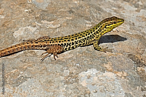 Naklejka premium Italian Wall Lizard (Podarcis siculus) in Mount Cofano nature reserve on...