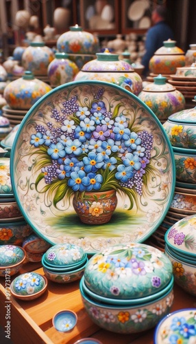 Fototapeta premium italienische Töpferwaren mit einem Vergissmeinnicht Motiv auf einem Markt in...