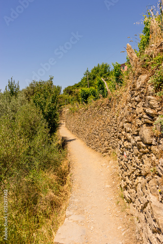 Fototapeta premium Italy, Cinque Terre, Corniglia, a path with trees on the side of a dirt road