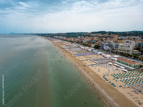 Fototapeta premium Italy, 09 June 2024: panoramic aerial view of the sea and the velvet beach of Senigallia in the province of Ancona Marche