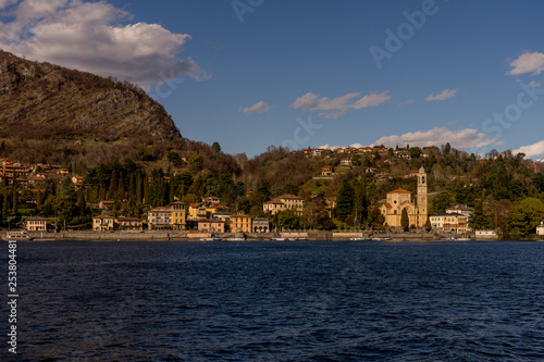 © SkandaRamana, Naklejka premium Italy, Lecco, Church clock tower overlooking Lake Como