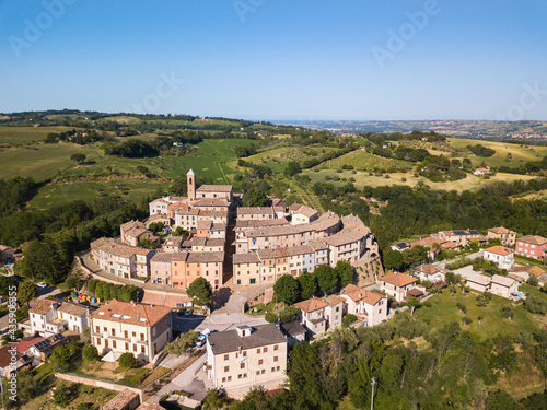 Naklejka premium Italy, May 2021. Aerial view of the medieval village of Serrungarina in the...
