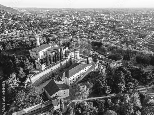 Obraz premium Italy November 30, 2023 - aerial view from the drone of the Brescia castle in Lombardy with the Maddalena hill