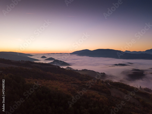 © cristian, Fototapeta premium Italy November 2021: aerial view of mountains with fog below in autumn season at sunset