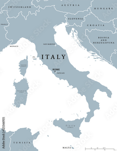 © Peter Hermes Furian, Fototapeta premium Italy political map with capital Rome, with national borders and neighbor countries. Gray illustration with English labeling and scaling on white background. Illustration.