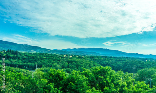 © SkandaRamana, Obraz premium Italy, Rome to Florence train, a tree with a mountain in the background