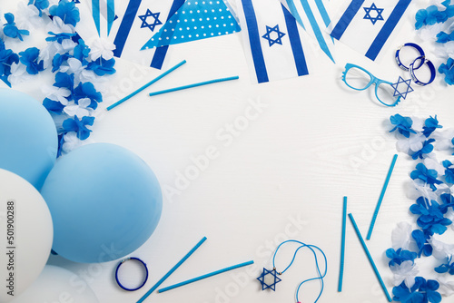 Fototapeta premium Items with the image of the Israeli flag. Patriotic holiday Independence day Israel - Yom Haatzmaut concept.