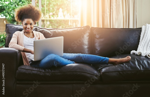 Naklejka premium Its my lazy day online. Portrait of an attractive young woman using laptop while chilling at home on the sofa.
