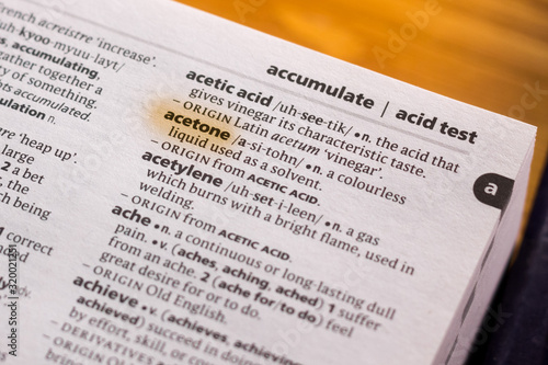 © sharafmaksumov, Fototapeta premium Ivanovsk, Russia - November 19, 2018: The word or phrase Acetone in a dictionary.