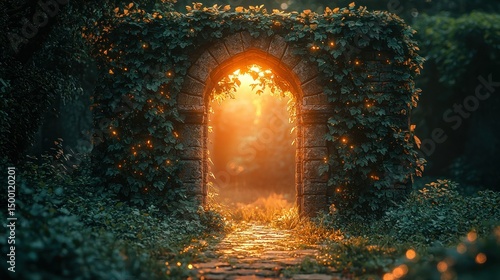 © arsyi_06, Fototapeta premium Ivy archway glows, path beckons into bright forest