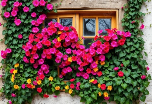 Fototapeta premium Ivy climbs a rustic window frame overflowing with vibrant flowers, antique,...