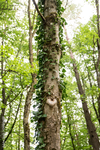 Fototapeta premium Ivy overgrowing beech trees in wild forest