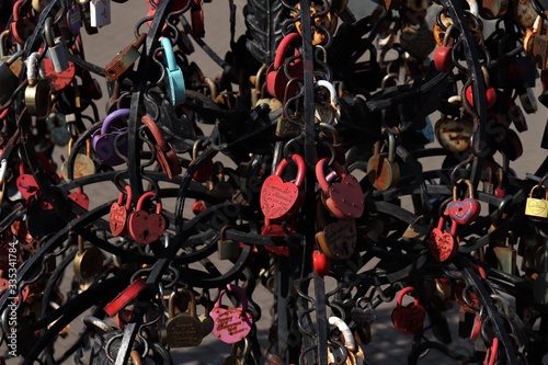 © Ruslan, Fototapeta premium Izhevsk / Russia - March 29, 2020: wedding multi-colored key locks.