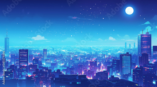 Obraz premium 70年代、80年代のシティポップを意識した都市の夜景のアニメ風イラスト,レトロポップ,日本人,懐かしい,エモい,J-pop,エモーショナル,チル,背景素材