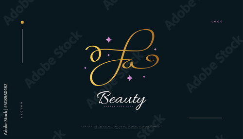 Fototapeta premium JA Initial Signature Logo Design in Gold Handwriting Style with Pink Stars....