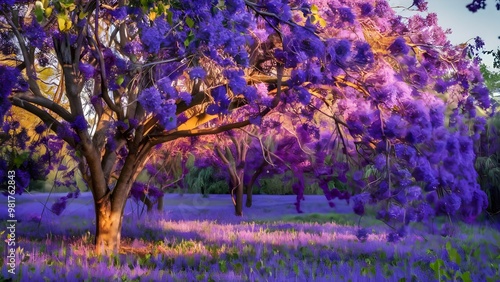 © NovaNicheTee, Naklejka premium Jacaranda tree in full bloom with purple flowers carpeting the ground